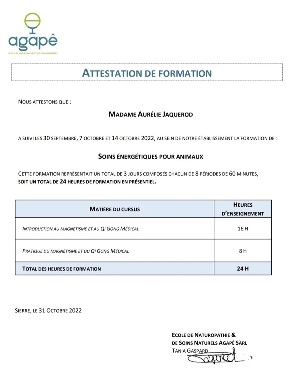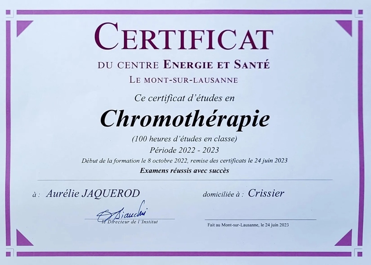 C’est à ce moment que j’ai découvert la chromothérapie, grâce à Virginie Rougemont, venue soigner Plume, ma chienne alors âgée de 15 ans. Les effets observés sur sa vitalité ont été déterminants et ont marqué le début de mon engagement dans cette voie.
